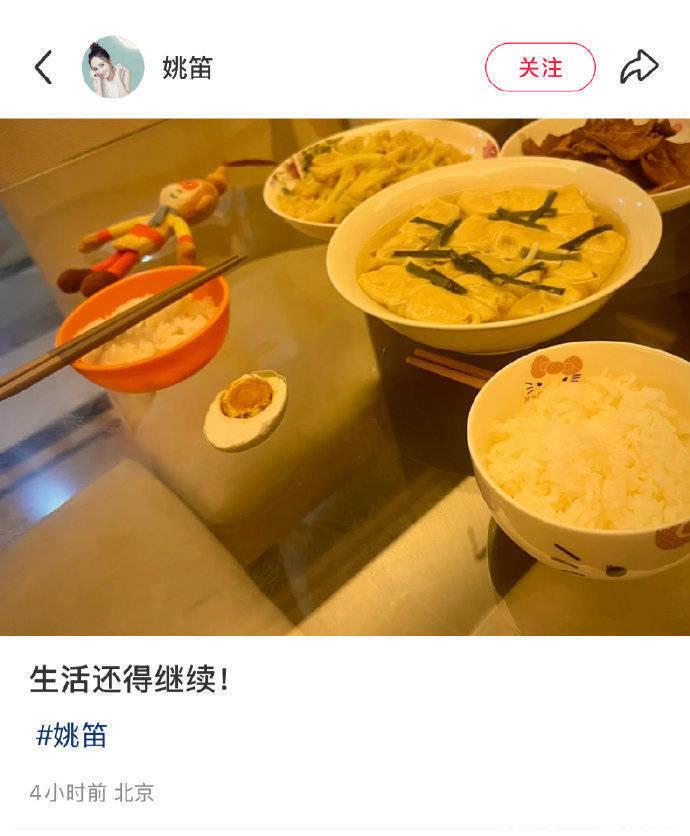 搜狐娱乐讯 20日,姚笛在社交平台上晒出吃饭照片,并配文称:“生活还得继续。” 此前,姚笛在《演员请就位3》中的所有演出内容都被删除,完全没有镜头,引发热议。